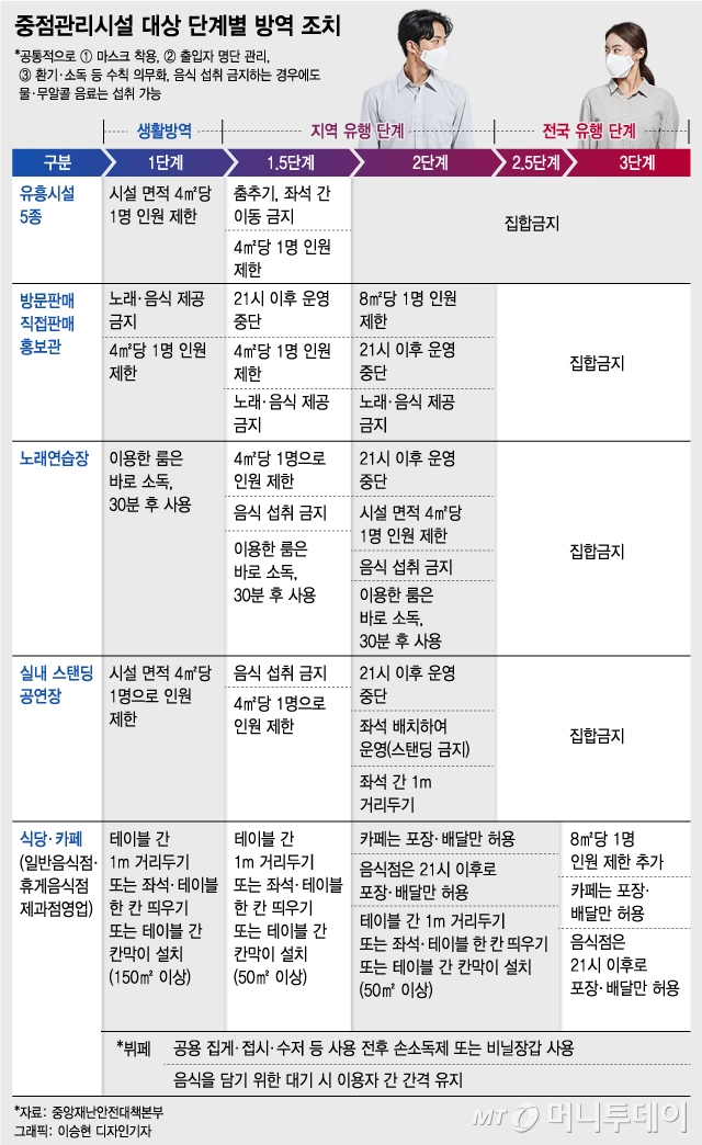 또, 4제곱미터당 1명으로 인원 제한을 시행 중인 클럽 등 다섯 종류의 유흥시설에선 춤추기와 좌석 간의 이동이 전면 금지 됩니다.
